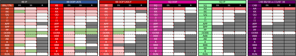 La tercera y útlima columna contiene las «situaciones especiales». Por estas me refiero a situaciones de 4-Bet tanto con posición como fuera de posición y los Squeeze y Cold 4-Bet.