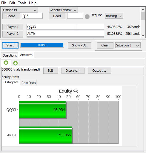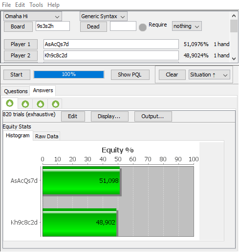 Por poneros algunos ejemplos de Equities de manos en Omaha, para que os hagáis una idea de porqué en algunos sitios o algunos jugadores, quieren tirar dos veces cuando se juegan un bote de 400bb en 25/50: