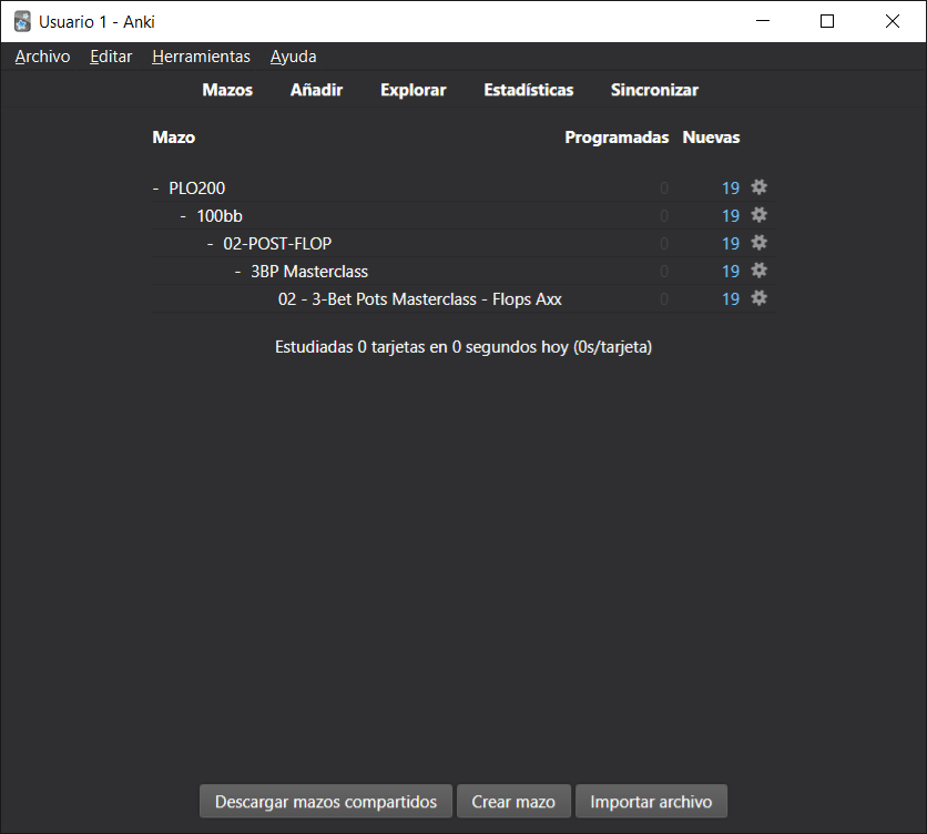 En la sección gratuita de PLO BRAIN he creado otro vídeo que estará disponible en breve, en el que muestro como instalar Anki y cómo configurarlo para una utilización optima enfocada al Póker.