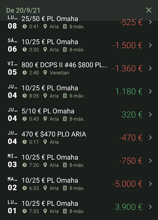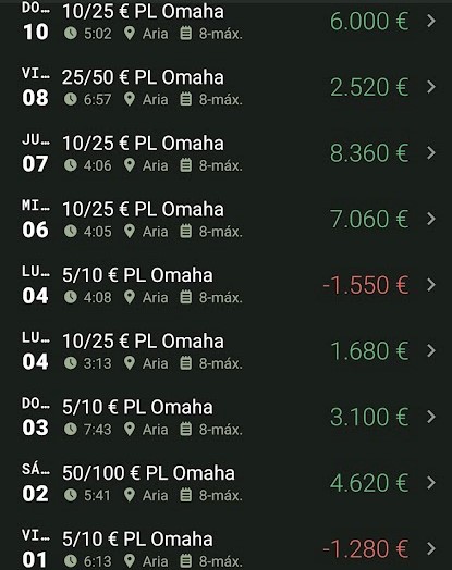 Comenzó una odisea de 2 meses donde sobre todo lo que he hecho ha sido jugar en vivo. Excepto por 3 torneos, y un par de incursiones en el 25.50 y 50.100, todo el volumen lo he metido en 5.10.25 y 5.5.10 Pot-Limit Omaha cashgames en el Aria.